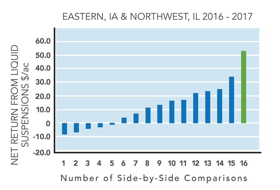 - Local on-farm research shows that surface banding liquid suspension fertilizers on 15" centers increases corn yields by 4.2 bu/ac and profitability by 16.7 $/ac compared to broadcasting equivalent rates of dry granular fertilizer.
